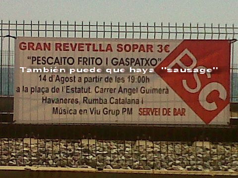 En Pineda de Mar (Barcelona); se hará una verbena popular el 14 de Agosto: (Espero sirva para financiar la revista; ("Aprop"), se pone en la página del Maresme; en la revista ("Aprop"),y en la del partido a nivel comarcal, Quizá ¿para que vayan todos los de la comarca?, porque los que somos de Pineda ya lo sabemos, y por si la población lo quiere saber , también se han puesto unos pasquines de información colgados en las calles. La fotografía, donde consta el símbolo del PSC, pone Gran verbena cena 3 euros. A continuación, hacen la gracia de turno, que aunque entrecomillado dice "pescaíto frito y gazpacho". Para animar la cosa, tendrán habaneras, rumba catalana y un grupo de música en vivo. Todo ello se hará en la plaça de el Estatut. Los del PSC, en la página del Maresme, dicen lo mismo, pero ponen pescado frito y pazpacho!? Bueno, no voy a decir yo que mi catalán es perfecto, porque mi catalán es bastante malo, aunque procuro hacerlo lo mejor posible y tendré el nivel de suficiencia o nivel B. Bueno, dejando la voluntad o no de las faltas de ortografía, no le encuentra la gracia a poner pescaito frito y gazpacho o poner pescado frito y gazpacho. Mirado así también podrian haber puesto que también habran "xorixos" ¿Esto qué es? El nuevo bilingüismo? La nueva gramática catalana o qué? Algo inocente o la política del P,S,C de la ambigüedad nacional y de la mexcla. De que somos catalanes y de Cataluña; y usamos la habanera y la rumba catalana para serlo? Los símbolos son importantes y, estos símbolos ya dicen mucho, como el símbolo de la plaza del Estatut. Que no digo que la habanera sea cosa catalana de cuanto venían de Cuba, y que la rumba catalana no represente cierto catalanismo, pero claro, qué catalanismo o nacionalismo catalán, lo que no va más allá del Estatut? Cosa curiosa ésta, de hacer la verbena popular la noche del 14. No se puede negar, que ciertas festividades religiosas han perdido su sentido y se celebran a nivel popular. Pero hacer una celebración popular siendo el día siguiente una festividad religiosa ¿para qué? Quiero decir que se puede hacer, faltaría más y, hacerla popular, pero si no le encontramos una simbología no entiendo ¿Por la presencia del Alcalde de Pineda? ¿Por qué quiere hacer populismo y tener la clientela contenta?. Estos del P.S.C ya no saben qué hacer. Que la plaza del Estatuto, será como la ofrenda al monumento Rafael Casanovas, me parece que existen cada vez menos argumentos para ser separatista; ni catalán ni español o jugar a la ambigüedad, al bilingüismo, a dicho federalismo,P.C.A. Dale al pueblo pan y circo, y lo tendras entretenido...